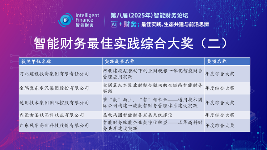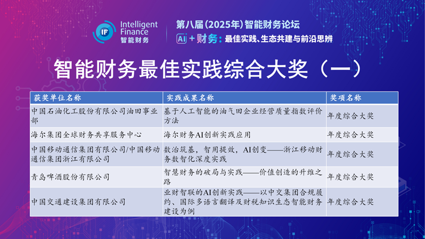 论坛上,第六届智能财务最佳实践评选结果正式揭晓。10家单位荣获智能财务最佳实践单项奖,3家单位荣获智能财务最佳实践最佳网络人气奖。