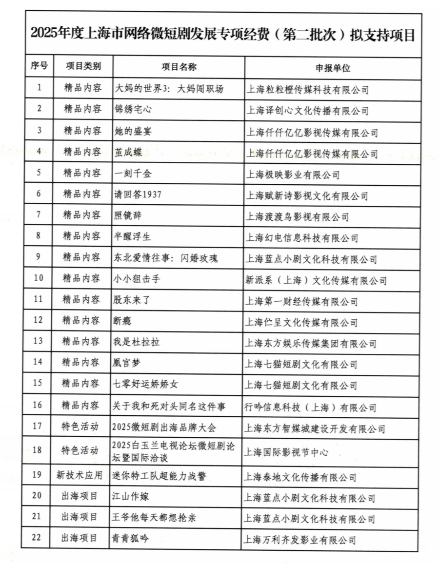 日前,上海市文化和旅游局发布公示,公布2025年度上海市网络微短剧发展专项经费(第二批次)拟支持项目名单,公示期为2025年11月28日至12月4日。