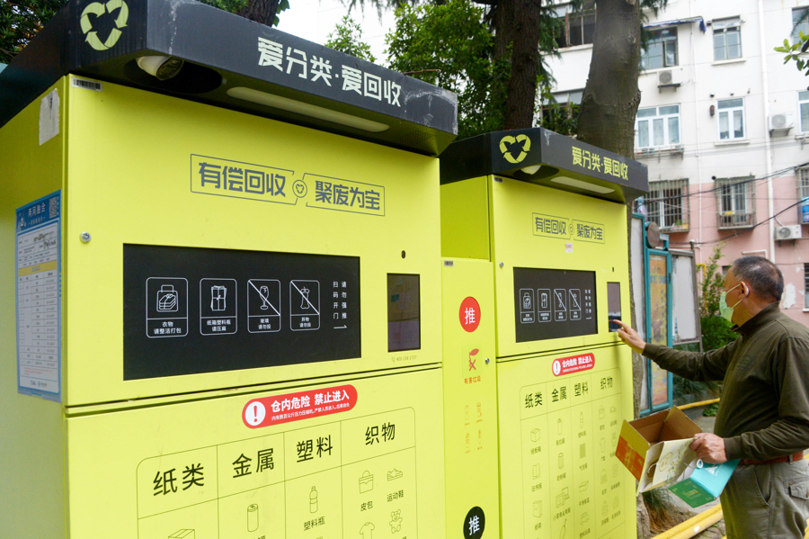 市民使用“爱回收”智能回收机投放可回收物 杨建正 摄