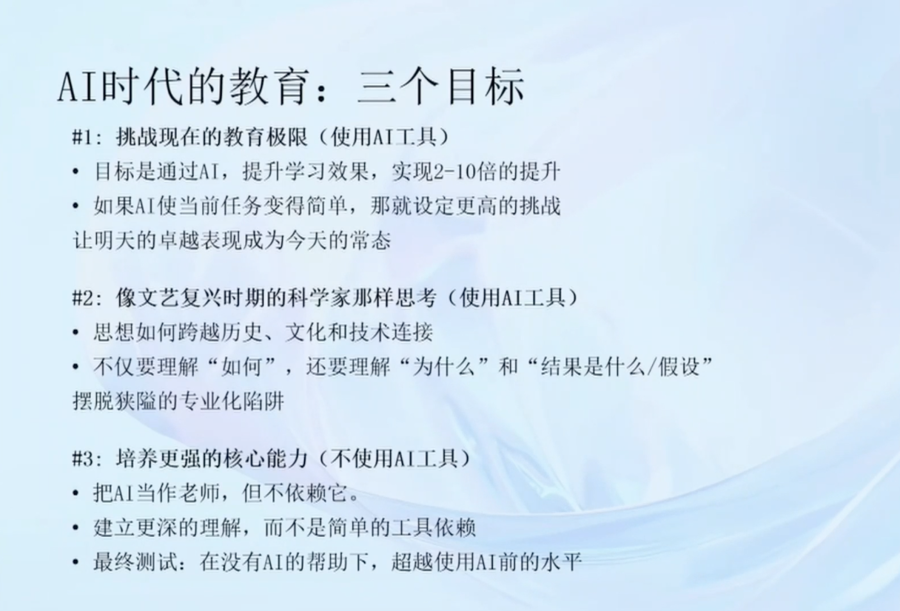 “AI与教育融合,关键在于明确AI不是目的而是手段。”张峥对此提出三大层层递进的核心目标:首先,使用AI必须带来实质性的效能提升,“KPI一定要提高,学得更快、更好、更深,否则就没有意义”;其次,应借助AI作为“广谱导师”的独特优势,引导人类突破专业教育造成的“窄谱”局限,走向更宽广的知识领域;最终,教育必须培养一种超越工具依赖的元能力,当拥有AI时,人能如虎添翼,而在“断网、断电、没有GPU”的极端情况下,人的基础能力反而比前人更强。