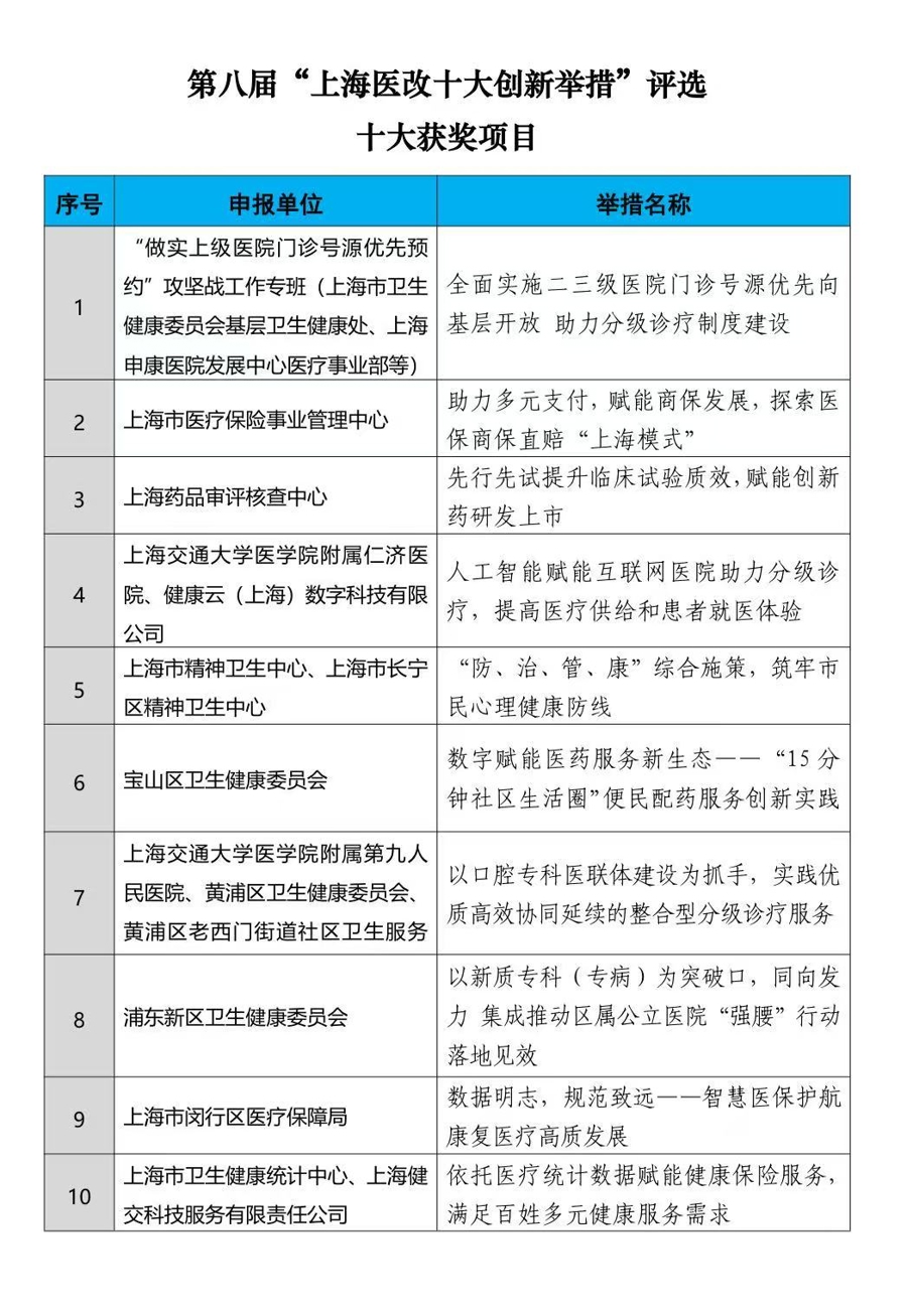 深化健康上海建设,今天(12月19日),第八届“上海医改十大创新举措”揭晓,“号源下沉”、医保商保直赔“上海模式”等举措列为十大获奖项目。