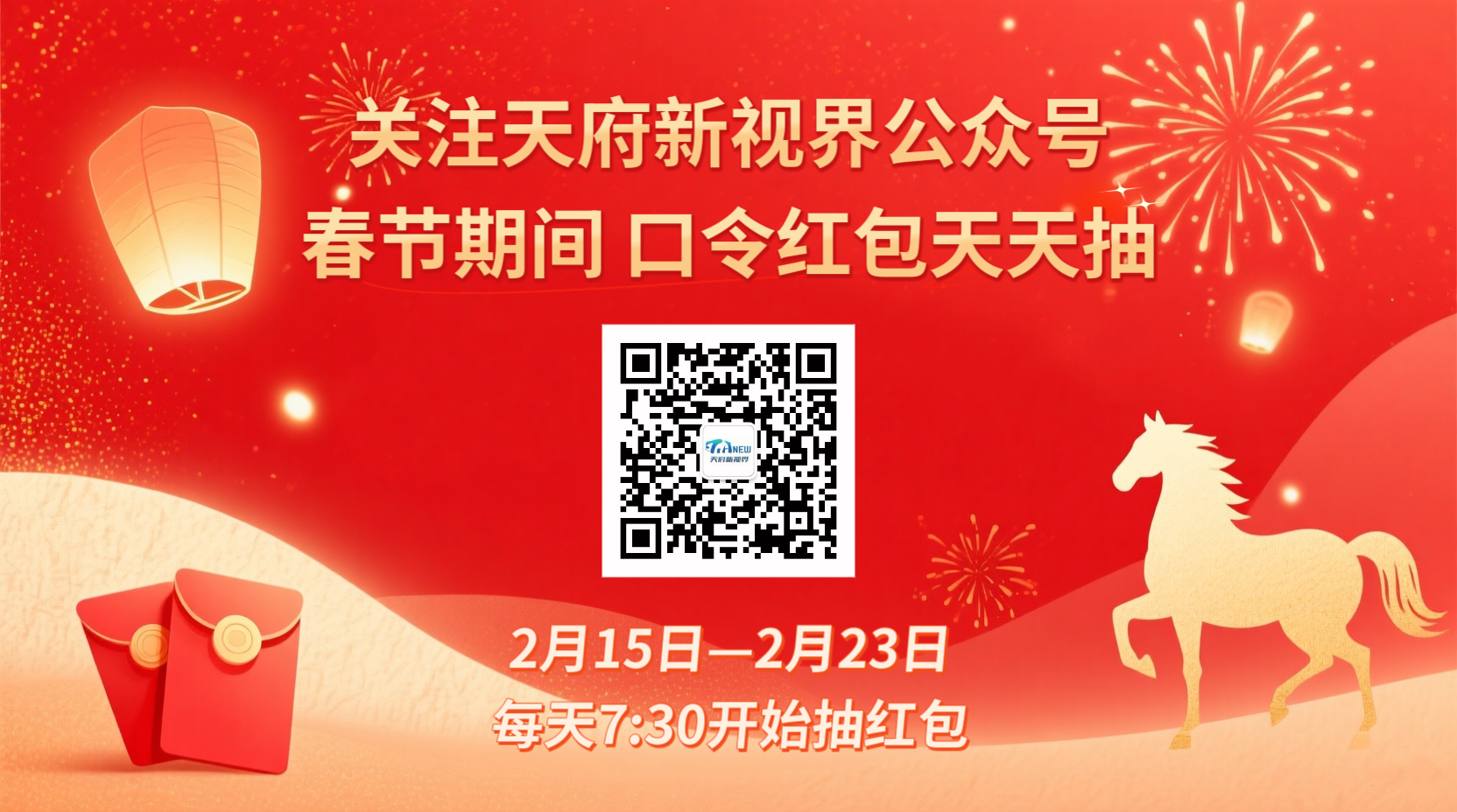 2月15日起,天府新视界公众号将连续9天推出“马年口令红包”活动,每天7:30准时开抢,助你开启新年好运!同时,参与“我心目中的‘锦绣天府·安逸四川’”征集活动,用镜头和文字定格四川年味瞬间,就有机会赢取最高万元现金大奖!