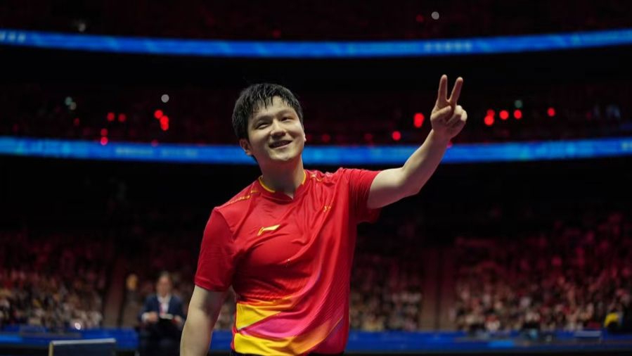 樊振东夺冠后庆祝 新民晚报 李铭珅 摄