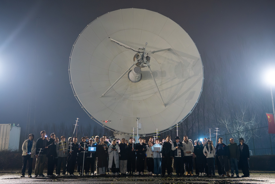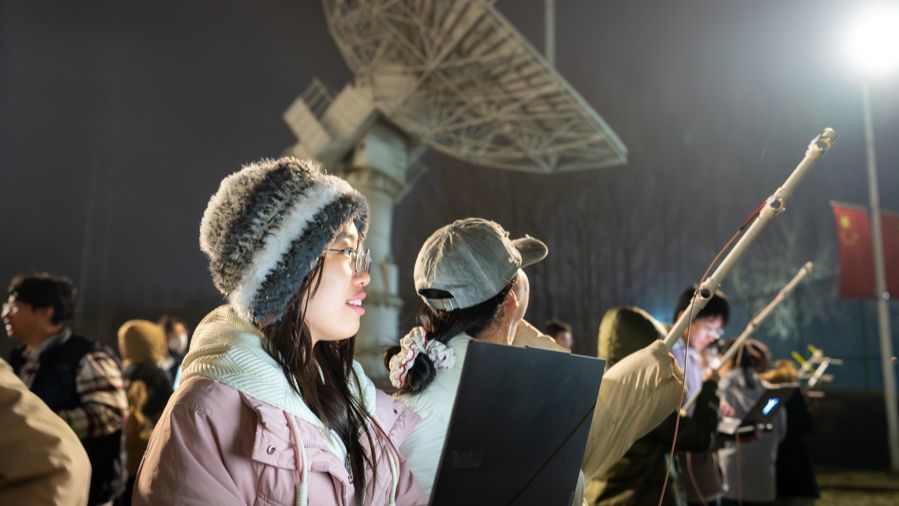 20时38分,现场氛围到达顶点——阿斯图友谊号卫星划破夜幕,如期过境。现场的爱好者屏息以待,纷纷捧起笔记本电脑,屏幕的微光照亮一张张专注的脸庞。他们高高举起亲手打造的自制天线,如浪潮般朝着卫星移动的星痕齐齐对准。那一片整齐划一、朝向天际的“金属触角”,与不远处13米口径卫星地面站的庞大身躯相映成景,宛如一片在夜色中向着星光颔首的“向日葵花田”,壮阔又动人。