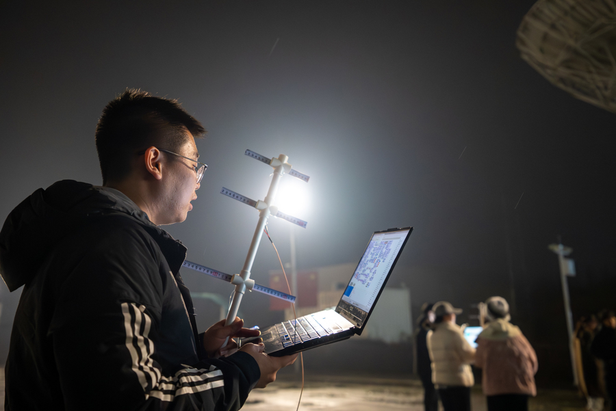 气温已近零摄氏度。同学们两人一组,一人手捧笔记本电脑,一人举着天线,在大口径雷达“大锅”下面的广场上查询着卫星位置。这款软件叫“look4sat”(寻找卫星),可以实时查询全球范围内的卫星轨迹,并利用手机上的陀螺仪和指南针匹配方位。孔祥祎将手机和天线杆绑在一起,确保手机指向的位置,即为天线应瞄准的卫星方位。有人的笔记本屏幕上闪现了雪花点,指导老师告诉同学们,宇宙中充斥着不携带有效信息的电磁波,所以老式天线电视的雪花其实就是空间中电磁波的可视化表现。