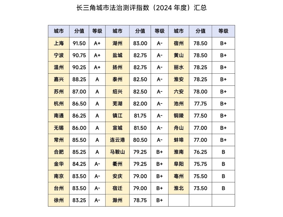 长三角城市法治指数测评于2020年启动,每两年测评一次。在此次发布会上,长三角城市法治指数测评项目总策划、长三角一体化法治研究院院长刘平介绍,该指数构建了包括依法治市、科学立法、严格执法、公正司法、全民普法守法、阳光政府、社会治理、营商环境、法律服务等9大一级指标、115项二级指标的测评指标体系。测评结果不仅反映城市法治建设总体情况,还横向对比城市之间的亮点和不足,并提出意见建议。此次测评显示,平均得分达到81.66分,较2022年的78.23分提升了3.43分,整体评级从“良好”跃升至“优秀”。评级优秀的城市数量大幅增加:从2022年的15个增至23个,优良率持续保持100%。三个城市获A+评级,分别是上海(91.5分)、宁波(90.75分)、温州(90.25分),温州首次跻身A+行列。